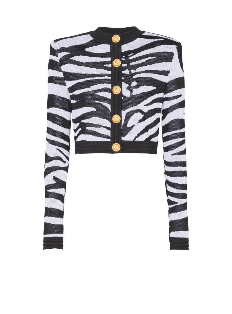 Balmain狮子王系列金釦黑白斑马纹针织短版开衫