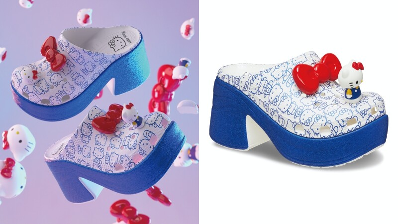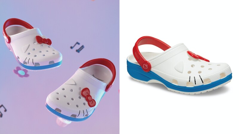 在2023年正式回归时尚圈的洞洞丑鞋Crocs曝光与Hello Kitty的联名系列,共推出高跟款、经典款与隐藏的红色厚底鱼口鞋款,并由Kitty本尊亲身上阵,穿上高跟款拍摄宣传大片,可爱到不行!